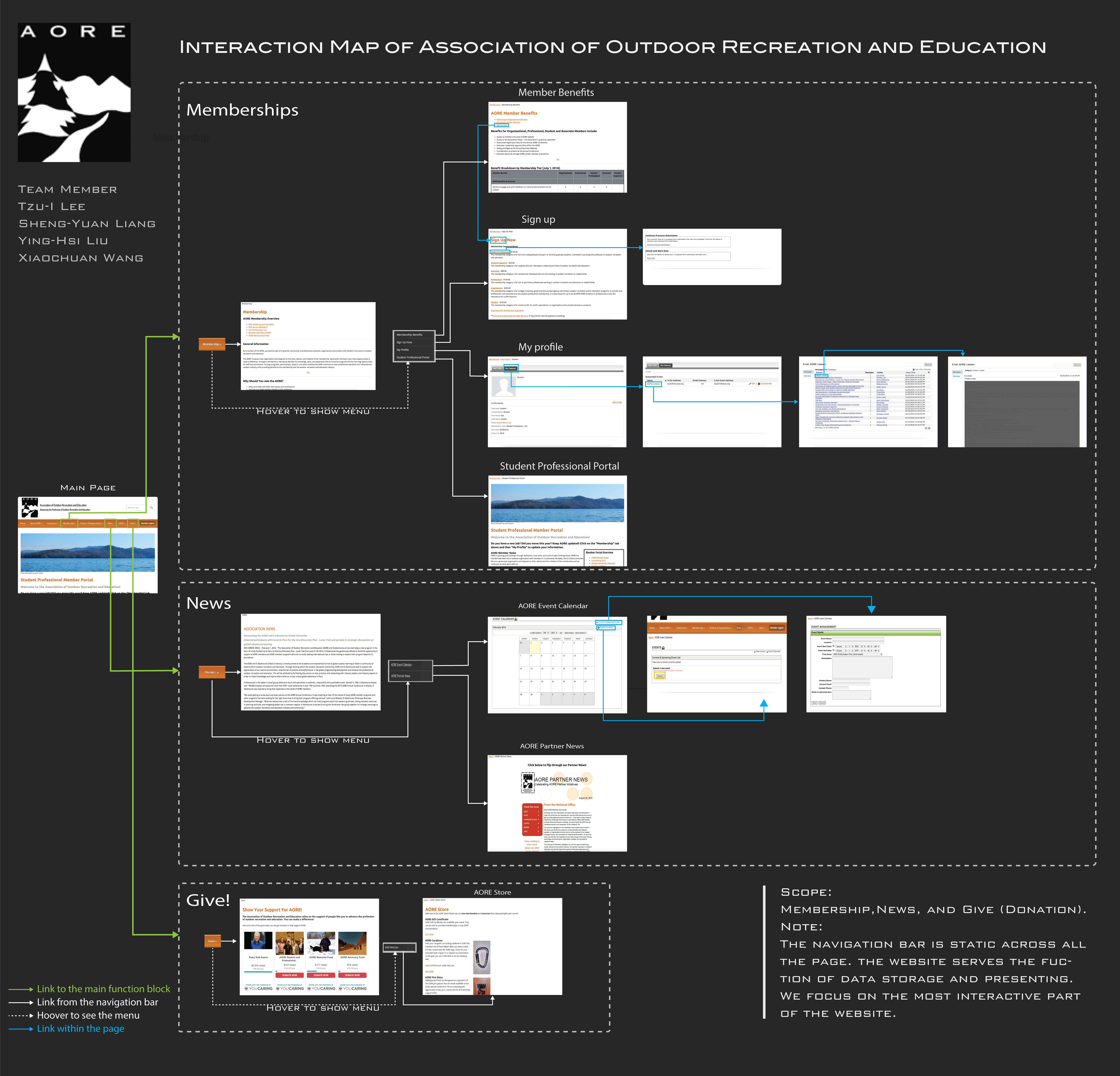Based on the clients’ Information, we focused on three main interactive functions of the AORE website, which are Membership, News, Give.